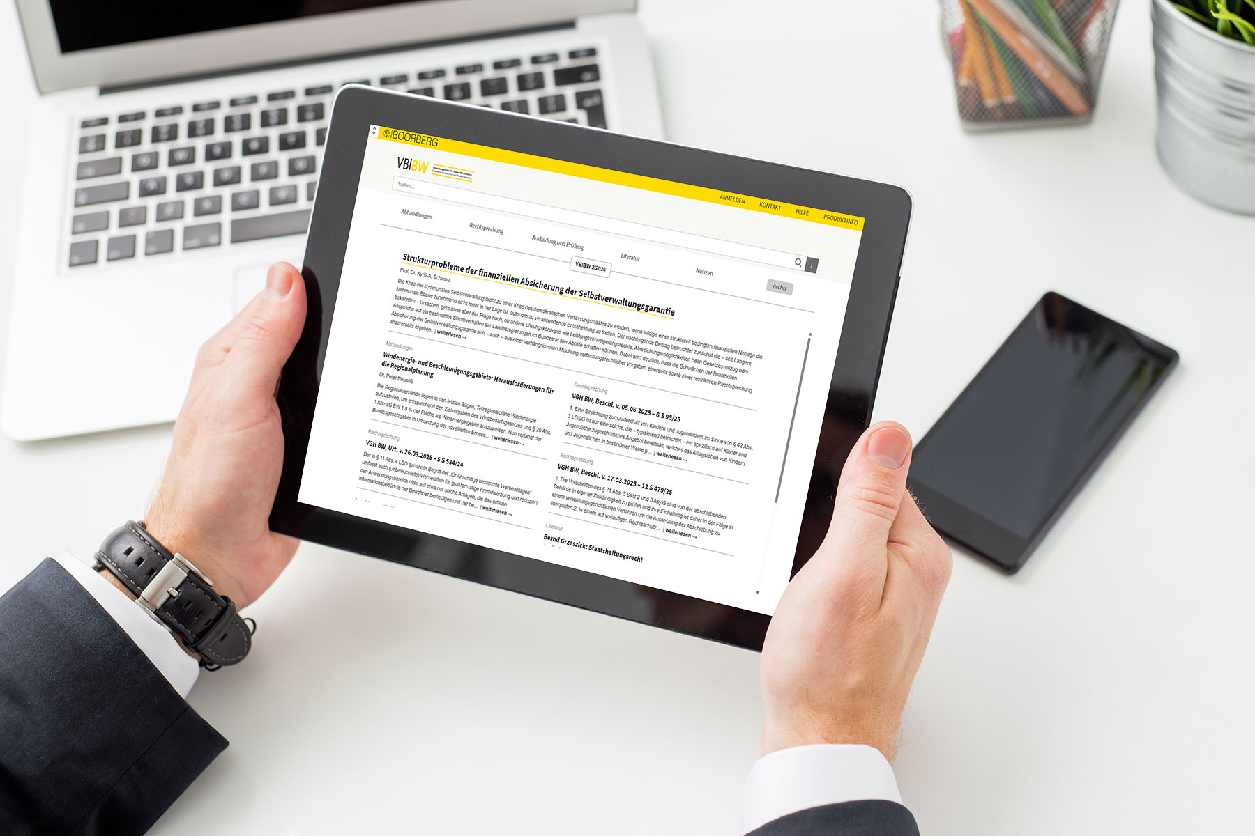 Die Vorteile des Online-Dienstes: hohe Aktualität, da Inhalte zum Erscheinungstermin verfügbar zentrale Suche Verlinkungen auf zitierte Normen und Entscheidungen Dokumentenvergleich mit dem »Lesemanager« Markierungen im Text und praktische Notizfunktion dauerhafte Lesezeichen Sammelmappen mit eigenen Dokumenten und Linksammlungen Archiv mit allen Beiträgen ab 2016 Mehr unter: vblbw.boorberg.de Die gewohnten Inhalte für Verwaltungsjuristen und Studierende Die »VBlBW« informieren über die Entwicklungen im Bundes- und Landesrecht. Buchbesprechungen und Wissenswertes ergänzen die Inhalte der Verwaltungsblätter. Kostenlos: Rechtsprechung mit VENSA Die Zeitschrift gibt einen Überblick über aktuelle verwaltungsgerichtliche Entscheidungen des VGH Baden-Württemberg sowie der Verwaltungsgerichte des Landes. Jeder Bezieher erhält einen kostenlosen Zugang zum Online-Dienst VENSA. Die verfassungs- und verwaltungsgerichtliche Entscheidungssammlung VENSA umfasst über 14.000 Entscheidungen des VGH und der Verwaltungsgerichte Freiburg, Stuttgart, Karlsruhe und Sigmaringen. Wissenschaftliche Beiträge Namhafte Autoren schreiben zu aktuellen Problemen des öffentlichen Rechts. Die praxisorientierten Abhandlungen berücksichtigen vor allem das baden-württembergische Landesrecht. Kompetente Schriftleiter und Herausgeber aus Wissenschaft, Gerichtsbarkeit, Verwaltung und Anwaltschaft bürgen für ein fachlich hohes Niveau und eine praxisgerechte Orientierung der »Verwaltungsblätter für Baden-Württemberg«. Ausbildung und Prüfung Prüfungsfälle mit methodischen Anleitungen und Lösungsskizzen (teilweise Klausuren aus dem Staatsexamen) unterstützen Studierende und Referendare. Alle Verwaltungsblätter online im Überblick entdecken Sie hier.